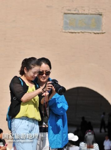 8月10日,兩名游客在嘉峪關(guān)城門(mén)前查看照片。