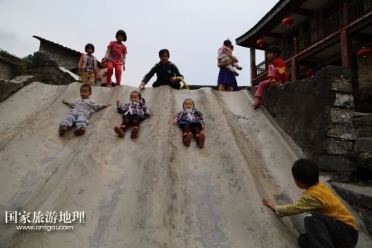 9月26日,孩子們在廣西昭平縣黃姚古鎮(zhèn)玩滑梯。