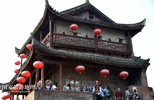 10月13日,來自湖南靖州苗族侗族自治縣的展演隊(duì)伍在鳳凰古城城樓上展示苗服。