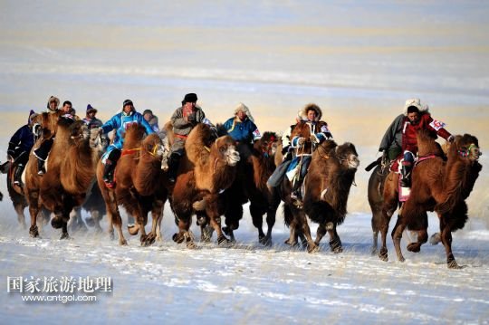 國家旅游地理 內(nèi)蒙古錫林郭勒1月5日訊 1月5日,牧民們在10公里駱駝速度賽比賽中。當日,內(nèi)蒙古烏珠穆沁駱駝文化節(jié)在西烏珠穆沁旗烏蘭哈拉嘎蘇木舉行。來自呼倫貝爾、鄂爾多斯以及蘇尼特和烏珠穆沁草原的牧民帶著200多峰駱駝在白雪皚皚的草原上進行駱駝選美、10公里駱駝速度賽等以比賽活動和民俗風情表演,展示內(nèi)蒙古草原上獨特的駱駝文化。 /新華社記者 任軍川 攝