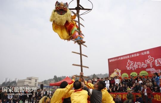2月4日,廣西象州縣的農(nóng)民舞獅隊(duì)在表演上刀山絕技。