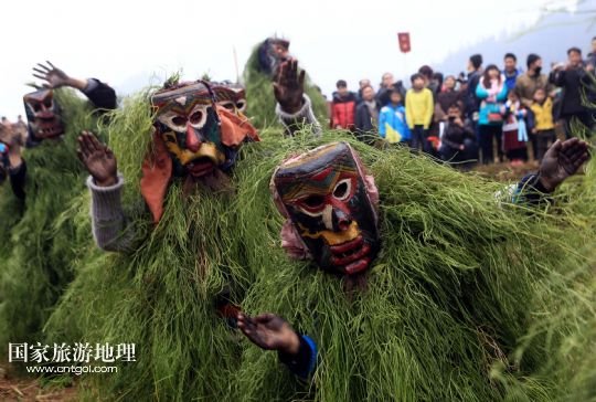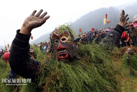 國(guó)家旅游地理 廣西柳州2月20日訊 2月16日,一名苗族青年戴著面具、披著芒草,扮成 “芒哥”跳舞。當(dāng)日是農(nóng)歷正月十七,地處深山的廣西柳州市融水苗族自治縣安陲鄉(xiāng)在江門(mén)苗寨舉行傳統(tǒng)的“芒哥節(jié)”。眾多苗族男性青少年戴著面具、披著芒草、扮成“芒哥”起舞,為人們驅(qū)邪避禍,送去新春的祝福。據(jù)介紹,演“芒哥”是當(dāng)?shù)孛缂胰霜?dú)具特色的新春傳統(tǒng)活動(dòng)之一。 /新華社發(fā)(龍濤 攝)