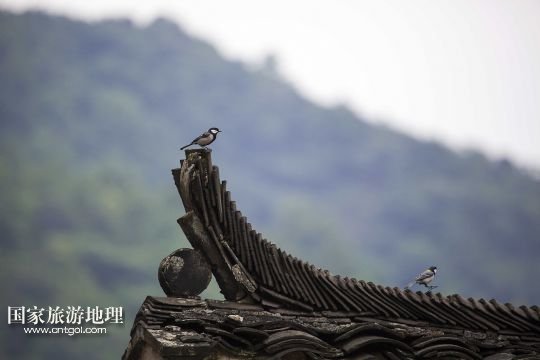 5月11日,兩只小鳥(niǎo)在土目源村的石屋上休憩。