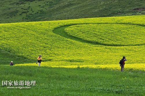 7月14日,游客在甘肅民樂油菜花海游覽。