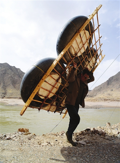老黃扛起百十斤重的筏子。