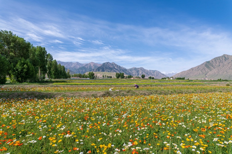 地處祁連山北麓高海拔山區(qū)的甘肅省高臺(tái)縣新壩鎮(zhèn)紅沙河村種植的虞美人繽紛綻放