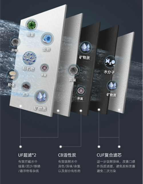 除去主濾芯,另外兩個(gè)副濾芯分別是CB活性炭濾芯和CUF活性炭超濾膜復(fù)合濾芯。其中,CB活性炭濾芯吸附水中余氯、異色異味、有機(jī)物,改善飲水口感,讓自來(lái)水變得更加甘甜鮮活,口感甚佳;而CUF活性炭超濾膜復(fù)合濾芯則能進(jìn)一步吸附水中的余氯等異色異味,提升飲水口感,并防止碳粉泄露和微生物侵入,避免水質(zhì)二次污染。